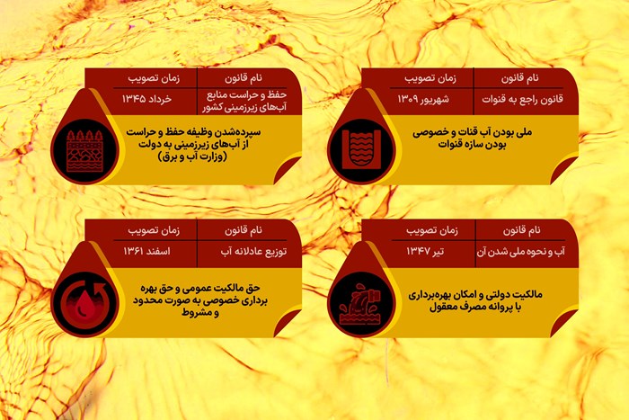 این گزارش به بررسی ریشههای بحران کنونی آب در قوانین پرداخته است. بررسیها نشان میدهد مالکیت آب از بدو قانونگذاری عموما بهصورت دولتی و عمومی در نظر گرفته شده و تنها حق بهرهبرداری به صورت محدود و مشروط به افراد حقیقی و حقوقی واگذار شده است...